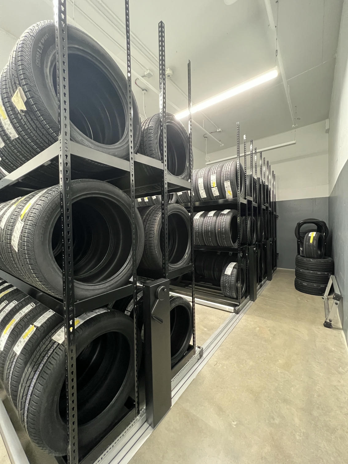 Mobile tire racks take this efficiency one step further by saving on floor space while still offering easy accessibility. These moveable tire racks eliminate the need for fixed aisles between rows, allowing more storage capacity. Then, when you need to access a row, you can just crank the hand motor or press a button on electric models to move the rows with ease. These mobile tire racks offer a space savings solution that support bulk tire storage.