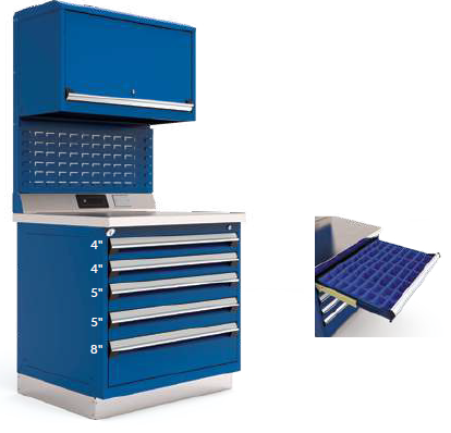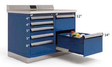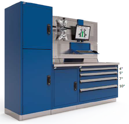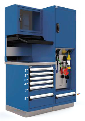 A tire change requires a variety of specialized parts and tools, making a customized workspace essential. Having a Tire Change Station can create efficiency for tire changes by keeping parts and tools in one centralized space. When installed next to a tire changer machine, it eliminates the lengthy back and forth between the machine and station, saving valuable time. This station features plastic bins for neatly organizing small part and a power feed panel that provides constant access to power. With the drawers, overhead bin, and small plastic bins, there is plenty of storage for the tools and parts that one needs on hand.