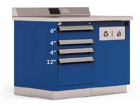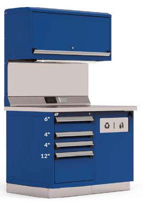 These next two stations are commonly used in automotive dealerships. The Basic Oil Change Station and Quick Oil Change Station offer storage in drawers that slide in and out, opening 100% for access. You can customize these automotive storage units to include taller drawers to hold items like cans and towels while smaller drawers that can have dividers are included for smaller tools and parts. Both of these oil change stations include a power feed panel that provides constant access to power. The Quick Oil Change Station also includes a waste and recycling door so that workers can throw items away easily, ensuring a clean workspace.