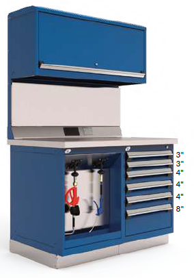 The Complete Oil Change Station has a reel cabinet with two openings and a removable drop try for easy cleaning. This keeps things neat and tidy, providing a space for small parts in the drawers, larger items on top, and a work surface.