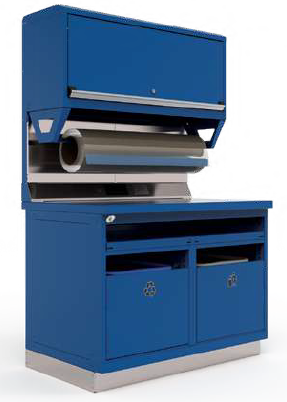 A Vehicle Preparation Station provides specialized storage for protective sheets, floor mats, and more. This automotive station has a storage cabinet on top to keep finishing equipment handy. Equipped with waste & recycling doors for concealing containers, these stations help to eliminate clutter. Each vehicle preparation station comes with a roll holder for protective plastic wrap along with a shelf for discreet storage designed for protective sheets for floor mats while keeping them within easy reach.